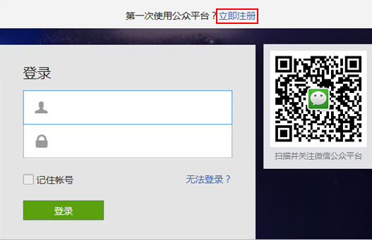 通过电脑登录微信公众平台官网:http://mp.weixin.qq.com/,点击右上角的“立即注册”。